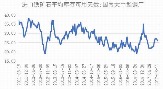 在利润驱动下,钢厂高炉维持满负荷生产。根据MYSTEEL数据,8月25日当周全国高炉开工率77.21%,唐山高炉开工率80.49%,两者均为高位水平,剔除淘汰产能的产能利用率接近90%。高产能利用率对铁矿石形成了刚性需求。25日当周主要港口铁矿石库存13473万吨,环比下降162万吨,至今为止,港口铁矿石库存已经从6月底高点14540万吨回落了1067万吨。